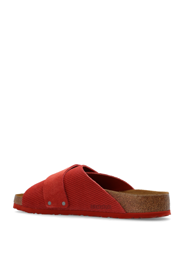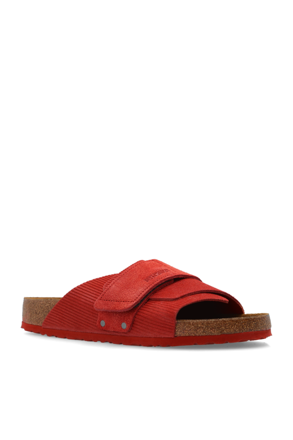 Red 'Kyoto' slides from Birkenstock. Crafted from ribbed suede, this model sits on a red sole in EVA foam and natural cork and features an embossed logo and velcro closures. Regular width.