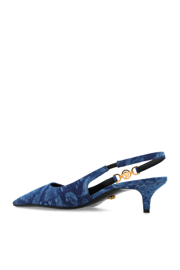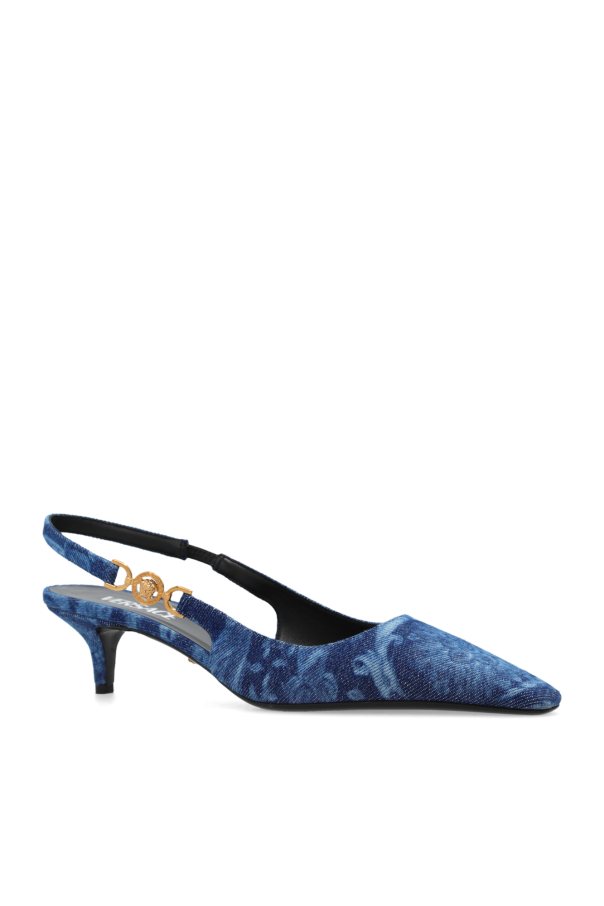 Blue denim pumps from Versace. Crafted from fabric and leather, this pointed toe pair features an elastic strap at the back and a black leather sole.