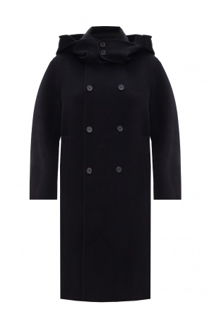 Black double-breasted coat from Dries Van Noten. Made of cotton, this design features buttons, a removable belt, collar, two slip pockets, long sleeves with buttoned tabs, raw cut edge and single rear vent.