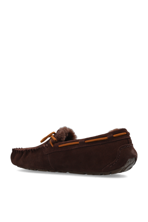 Dark brown ‘Dakota’ moccasins from UGG. Crafted from suede and trimmed with UGGplush®, this pair sits on a brown rubber sole and showcases lace-up detailing.