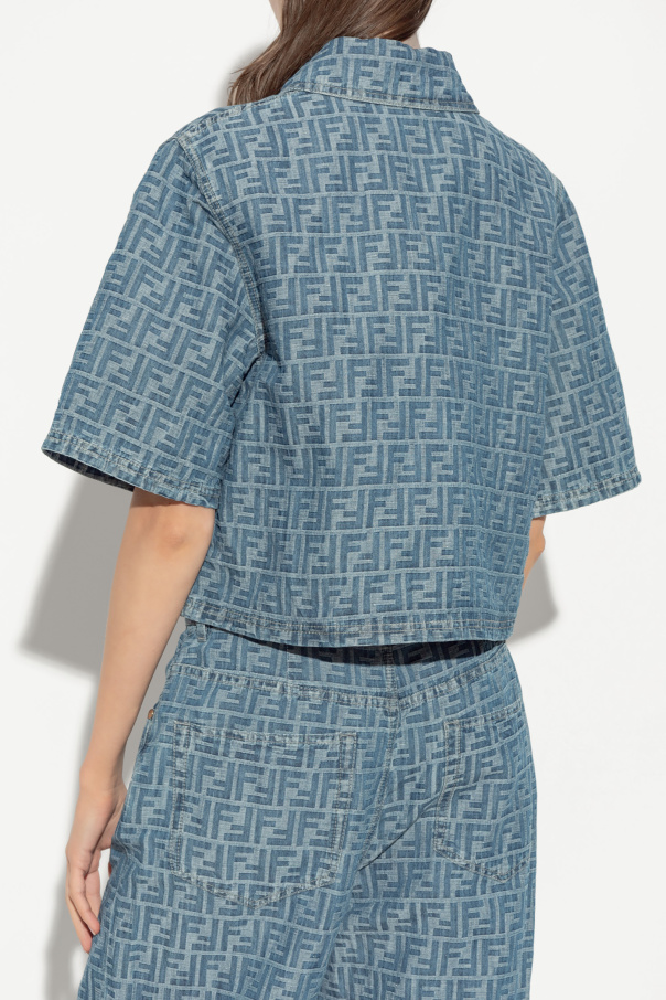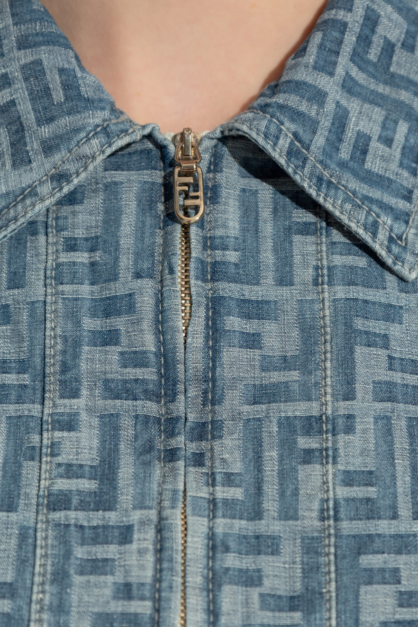 Introducing a masterpiece of modern fashion, the Zippered Denim Shirt from the exclusive collection by Fendi. This exquisite piece reimagines the classic denim shirt with a blend of innovation and sophistication. Its dominant blue hue is adorned with a distinctive, all-over pattern reminiscent of logos or monograms, creating a geometric design that adds a layer of intrigue and uniqueness. Crafted with a blend of linen and cotton, this shirt promises durability with a hint of stretch for enhanced comfort. The front zipper closure, a rare find in denim wear, is meticulously designed with a metal finish that matches the shirt's color scheme, subtly branded with the Fendi logo on the slider. The shirt's classic, small collar infuses a touch of elegance, while its relaxed fit and cropped length offer a contemporary edge, perfect for the modern fashion enthusiast. Additional details, such as the tailored seams visible on the back, enhance the shirt's shape and fit, making it as flattering as it is stylish. The short sleeves and round neckline complement the overall design, ensuring this piece is a versatile addition to any wardrobe. Why Purchase This Product? Exclusive Design: A unique geometric pattern and zipper closure set this shirt apart. Quality Materials: Crafted from a durable blend of linen and cotton for lasting wear. Comfort & Style: Offers a relaxed fit with a modern cropped length. Signature Elegance: Imbued with the sophistication and high fashion of Fendi.