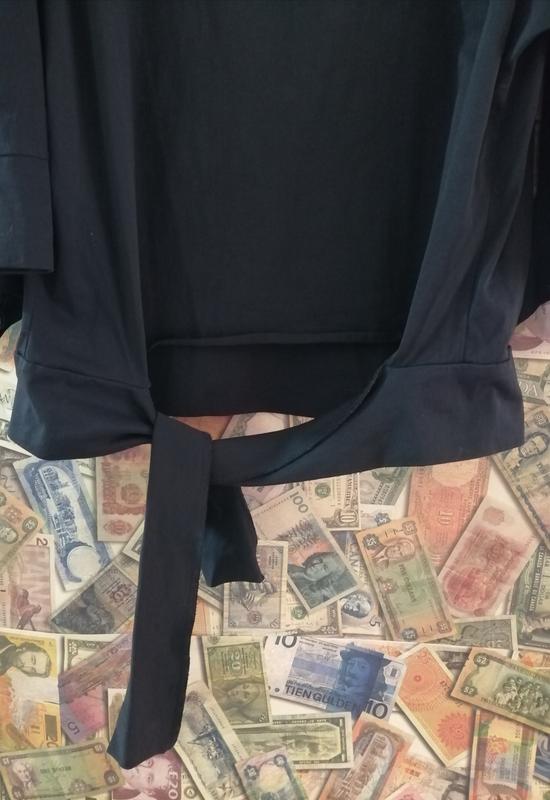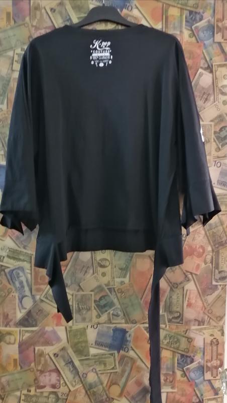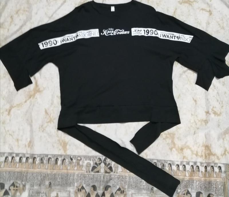 Новая черная кофта стильным кроем оверсайз. Длина55 см. По средине и с зади набита краска, белые полосы от груди до рукава пришита тесьма. Длина рукава от горловины55. 5 см.Очень классный крой рукава. Завязывающаяся лента по талии на спине или с одного бока в ширину 8 см. 100 cotton.Очень эффектная✌🏻 Страна Италия.Уступлю в цене.