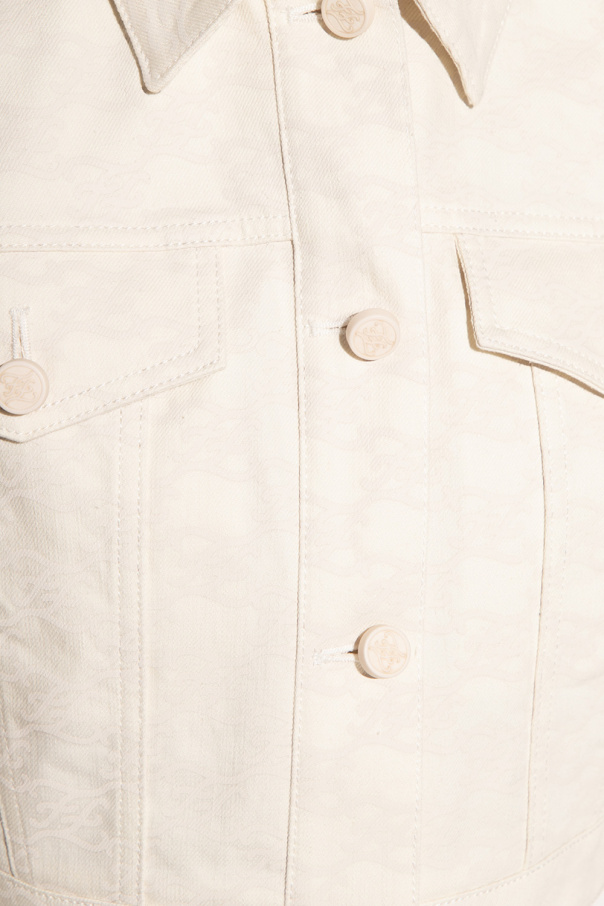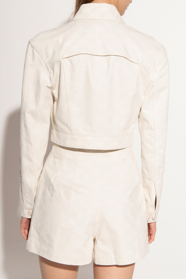 Cream cropped denim jacket from Fendi. Fastened with buttons, this garment features a printed pattern, two buttoned flap pockets and long sleeves with button cuffs.