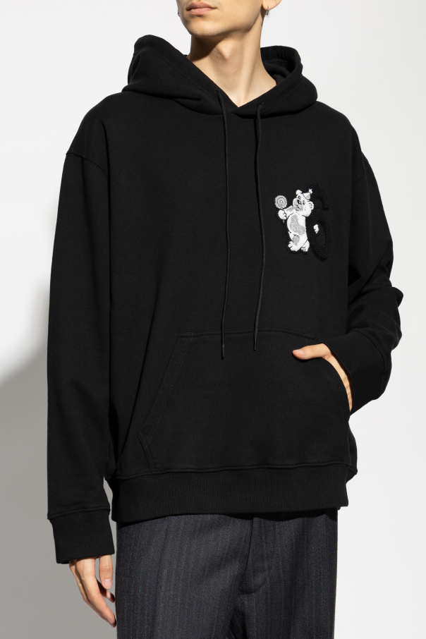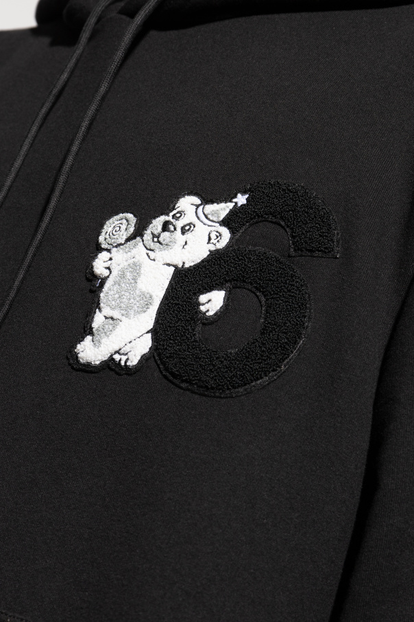 Discover the epitome of casual sophistication with the exclusive Black Hoodie by MM6 Maison Margiela. This piece is a testament to the brand's avant-garde aesthetic, seamlessly blending conceptual fashion with everyday wearability. Expertly crafted from soft, luxurious cotton, this hoodie features a classic, straight cut with long sleeves and an adjustable hood. The striking design includes a prominent embroidery on the left chest, depicting a whimsical number "6" alongside a charming bear holding a lollipop. The bear is rendered in white with gray accents, while the number "6" stands out in bold black. The hoodie also boasts a practical kangaroo pocket, perfect for keeping your hands warm or storing small essentials. The designer's logo is subtly placed on the inner side of the hood, adding a touch of understated elegance. Why Buy This Product? Supreme Quality: Made from 100% cotton for unparalleled comfort and durability. Unique Design: Features distinctive embroidery that sets it apart from ordinary hoodies. Functionality: Includes a convenient kangaroo pocket and adjustable hood. Exclusive Label: Part of the MM6 Maison Margiela collection, known for its innovative and artistic approach to fashion.