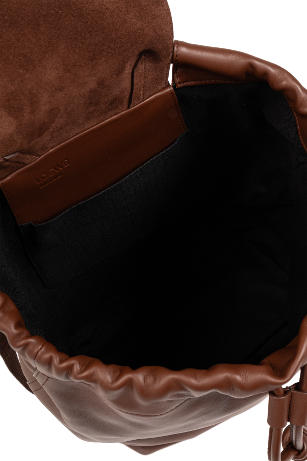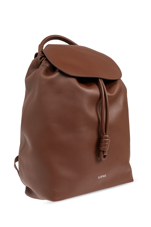 Introducing the Flamenco Backpack from Loewe's exclusive collection, a testament to timeless elegance and refined craftsmanship. This sophisticated accessory, crafted from premium brown leather, exudes a luxurious allure that seamlessly complements its minimalist design. The backpack features a rectangular shape with gracefully rounded edges, embodying a minimalist aesthetic that eschews superfluous embellishments. A discreet white "LOEWE" inscription adorns the front lower section, adding a touch of subtle sophistication. Designed for both style and functionality, the Flamenco Backpack boasts a flap closure with a decorative knot-tied drawstring, ensuring your belongings are secure yet easily accessible. Inside, a spacious compartment and a slip pocket, each marked with the Loewe insignia, provide ample storage for your essentials. Comfort is paramount with the inclusion of two broad, adjustable leather shoulder straps, allowing for a customizable fit. Additionally, a top handle offers the convenience of carrying the backpack by hand. Why Choose This Product? Crafted from high-quality brown leather for a luxurious appearance. Minimalist design with discreet branding for understated elegance. Functional flap closure with a stylish knot-tied drawstring. Spacious interior with a slip pocket, perfect for everyday essentials. Adjustable shoulder straps and a top handle for versatile carrying options.