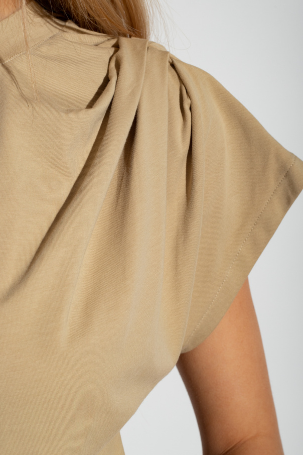 Beige ‘Charron’ asymmetric top from Iro. Crafted from cotton, this short sleeve design features decorative gathers and a ribbed crew neck.