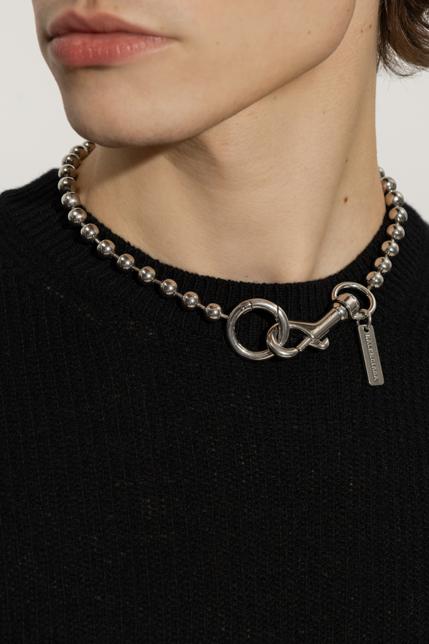 Silver-tone necklace from Balenciaga. Made of brass, this item features a beaded chain, lobster clasp closure and decorative logo-engraved plaque.