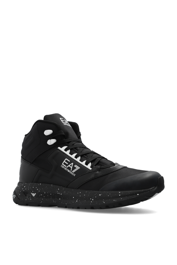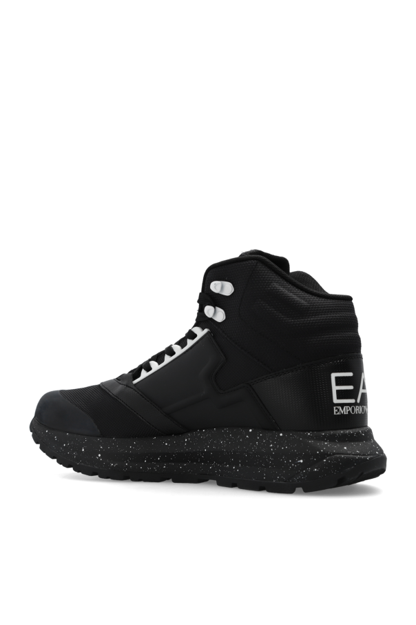 Black ankle boots from EA7 Emporio Armani. Made of padded material, this lace-up model sits on a black rubber sole with a decorative polka dot pattern and features a logo patch on the tongue and decorative rubber inserts with a logo.