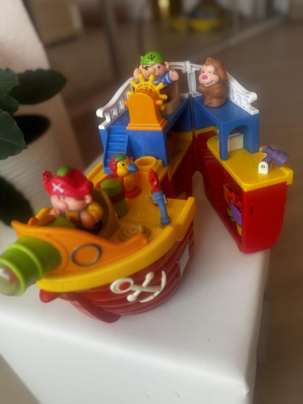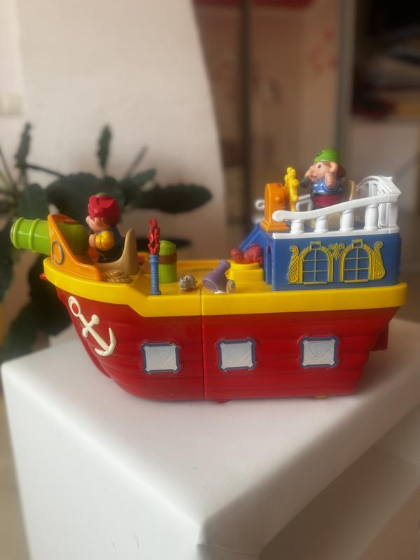 Игровой набор Пиратский корабль. Есть светлая и звук. Четыре персонажа, которые снимаются и переставляются местами. Есть дефект - поломочный парус, поэтому в комплекте его не будет. Питание от батареек АА. Корабль на колесах, что очень удобно для ребенка в игре. Размер 42х17х26,5.