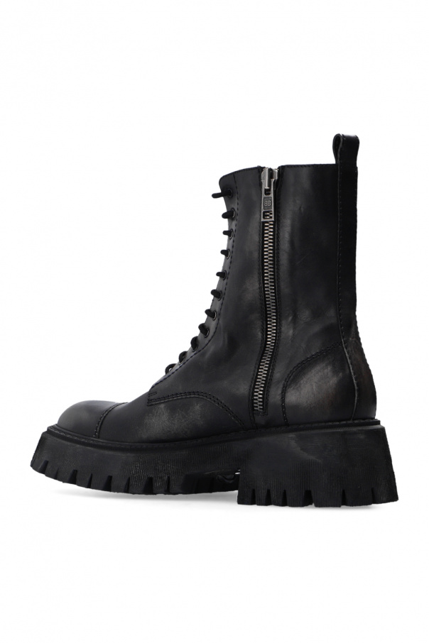 Black boots from Balenciaga. Made of leather, this lace-up pair features side zips, an embossed logo, a vintage effect and a black rubber sole.