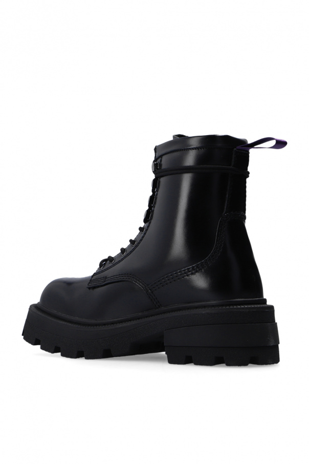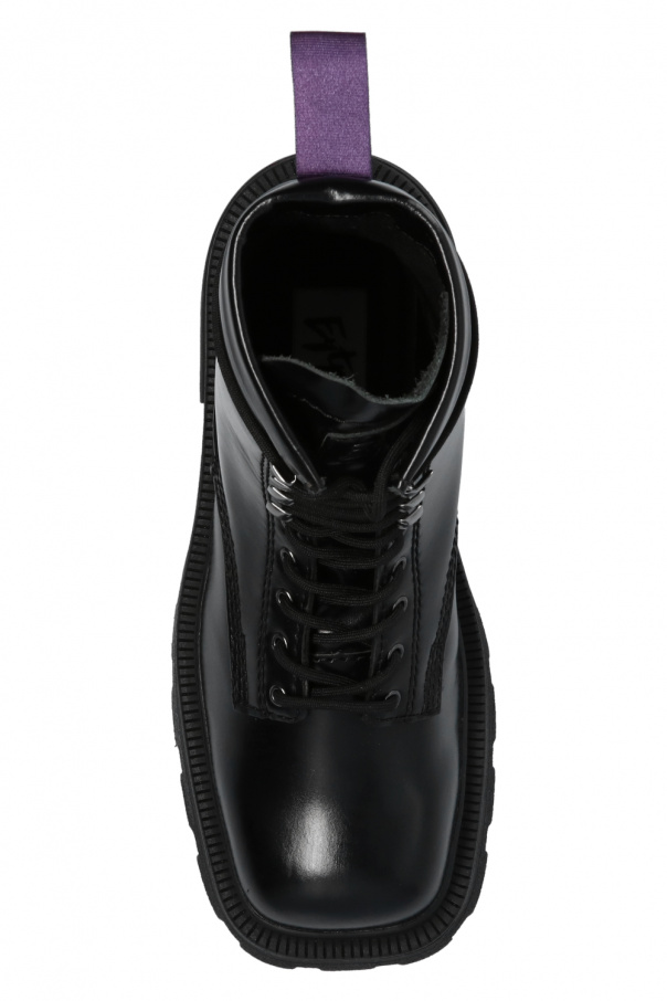 Black ‘Michigan’ ankle boots from Eytys. Crafted from leather, this model features a rubber logo appliqué, purple grosgrain strap at the back and black rubber sole.