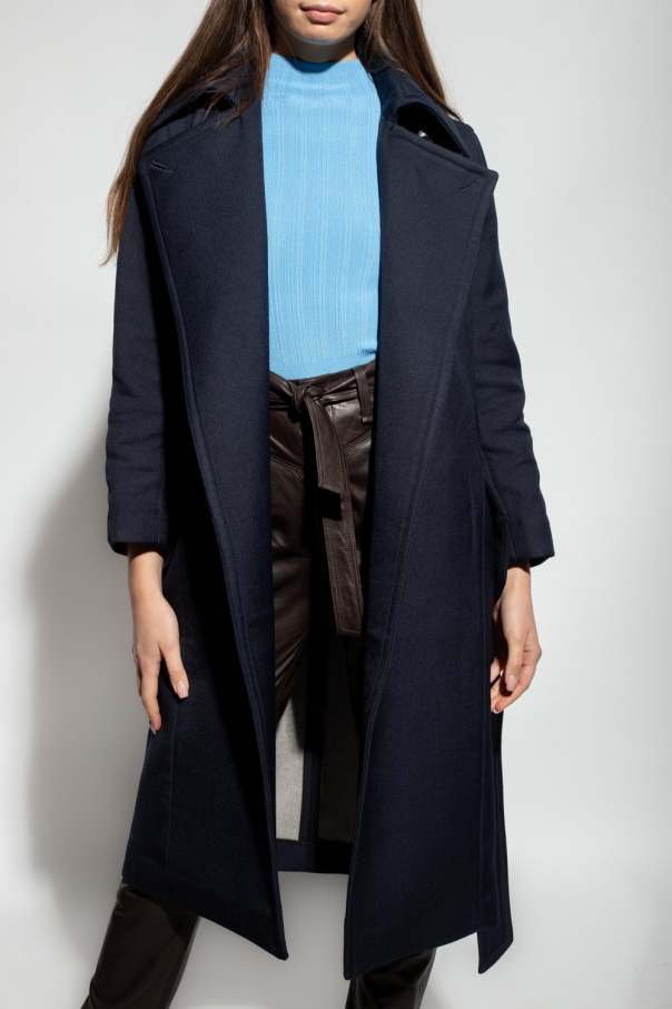 Navy double-breasted coat from Rag & Bone. Fastened with buttons, this long sleeve design features a waist belt, two flap pockets and a double rear vent.
