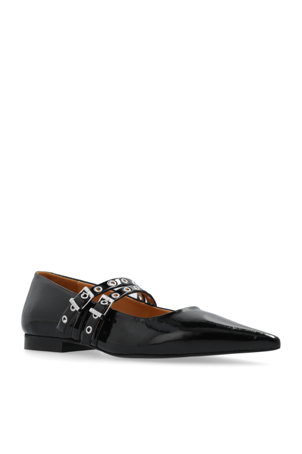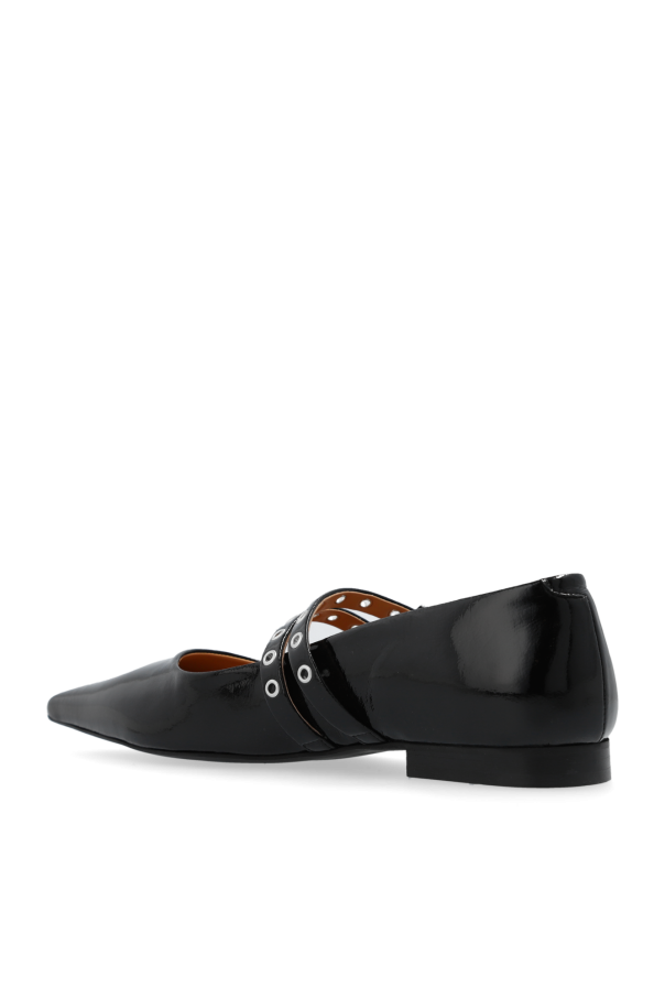 Introducing the epitome of refined elegance: Ganni's Patent Leather Ballet Flats. These exquisite shoes are a testament to sophisticated style and unparalleled craftsmanship. The dominant black hue, enhanced by the lustrous sheen of patent leather, encapsulates timeless grace. The design is accentuated by a pointed toe, lending an air of sophistication and refined taste. The surface, gleaming with a polished finish, is meticulously crafted from patent leather, ensuring both durability and a smooth texture that catches the eye. Notably, the incorporation of metallic elements—strips adorned with studs and buckles—crossing the foot's arch, infuses these ballet flats with a distinctive character, setting them apart from traditional designs. While the designer's logo remains discreet, the finishing touches suggest the hallmark of Ganni's renowned aesthetic. The flats feature a practical yet stylish closure system, with metal buckles that may serve as functional fastenings or purely decorative accents. The sole, flat for comfort and ease, subtly elevates with a height ranging from 0.5cm at its lowest to 1.5cm at its peak, ensuring a comfortable stride. Why Purchase This Product? Elegance and sophistication in design, perfect for enhancing any outfit. High-quality patent leather construction for durability and shine. Unique metallic details for a touch of character and distinction. Comfortable fit with a slight elevation, ideal for daily wear. Signature Ganni craftsmanship and style.