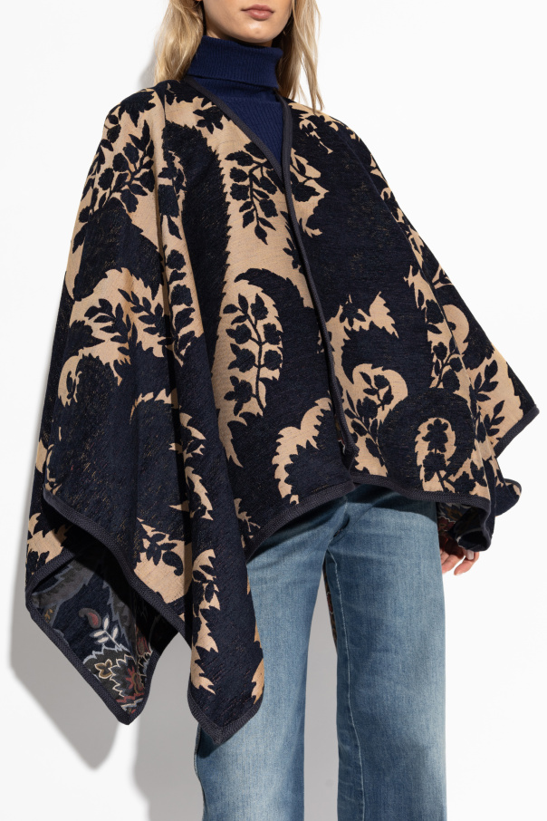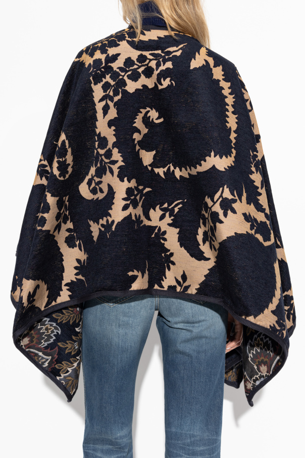 Introducing the Reversible Floral Poncho by Etro, a paragon of sophistication and versatility. This exquisite poncho, designed by the renowned Italian fashion house established by Gerolamo Gimmo Etro, epitomizes the luxury and artistry of Italian craftsmanship. Crafted from a sumptuous blend of cotton, viscose, polyester, and modal, this poncho ensures warmth and a lavish feel. The reversible design offers two distinct floral motifs: one side features a dark navy fabric adorned with a light beige floral pattern reminiscent of leaves and vines, while the other side showcases a more vibrant floral design in shades of beige, brown, red, and green against a dark background. The poncho's loose, rectangular cut with a head opening delivers both elegance and comfort. Meticulously finished edges prevent fraying, reflecting the high-quality standards of Etro. While devoid of overt logos, the craftsmanship speaks to its designer pedigree. Why You Should Buy This Product: Reversible Design: Offers versatile styling options. Luxurious Fabric: Made from a blend of high-quality materials for warmth and comfort. Exquisite Craftsmanship: Detailed finishing and elegant motifs. Timeless Elegance: Dominant dark navy color for a sophisticated look. Exclusive Design: From the esteemed house of Etro, known for its distinctive paisley and floral patterns.