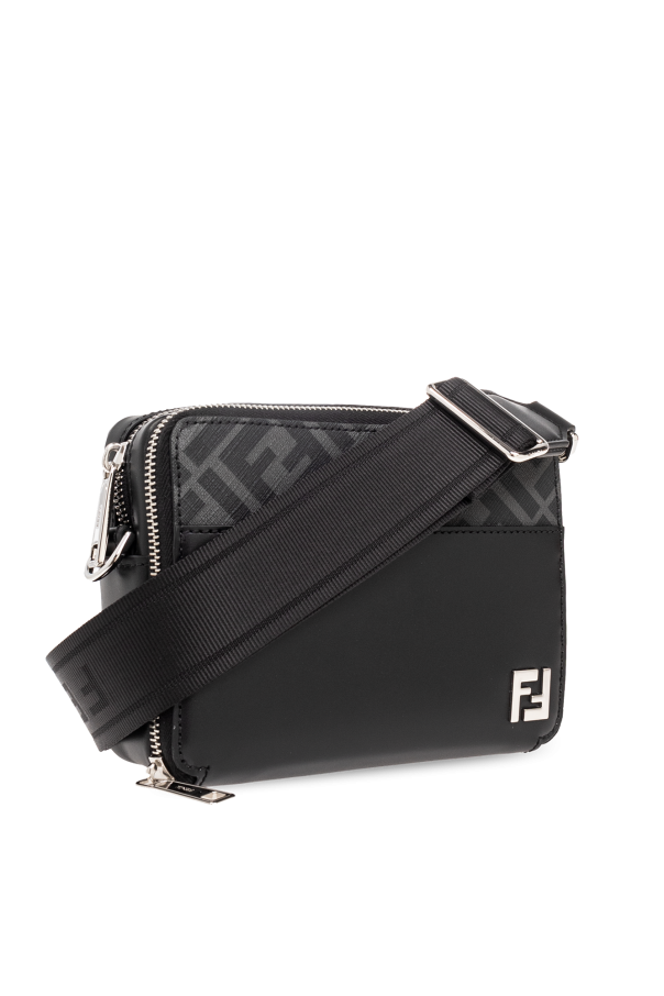 Black shoulder bag from Fendi. Made of calf leather and monogrammed coated canvas, this design showcases a metal logo plaque and one slip pocket on the front, a detachable and adjustable shoulder strap, silver-tone metal hardware and two internal zip compartments – one of them housed a partition and three card slots.