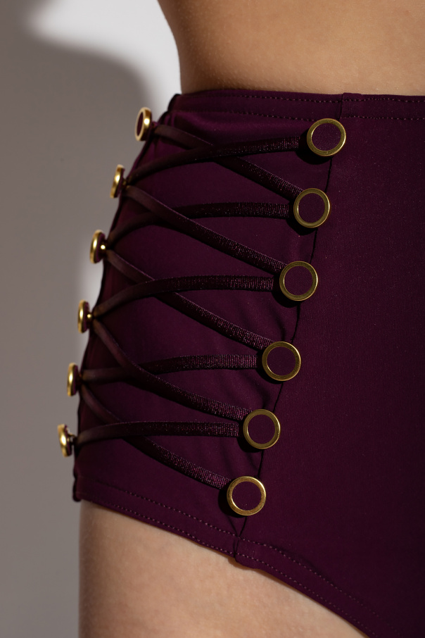 Dark purple two-piece swimsuit from Zimmermann. With a balcony top featuring adjustable shoulder straps and a back hook closure, this set comes with high-waisted bottoms with decorative tie closures and buttons on the sides.