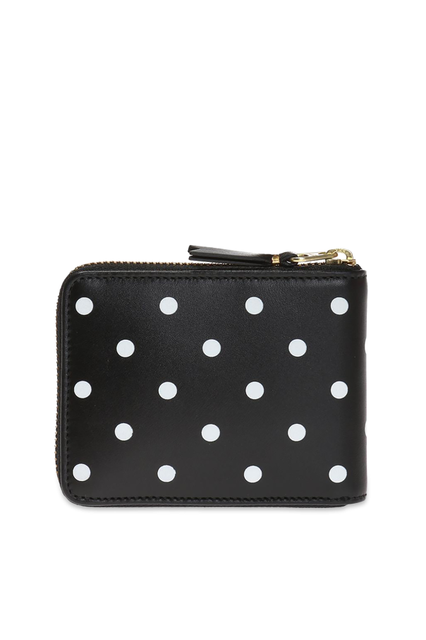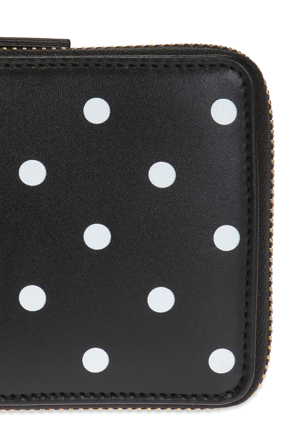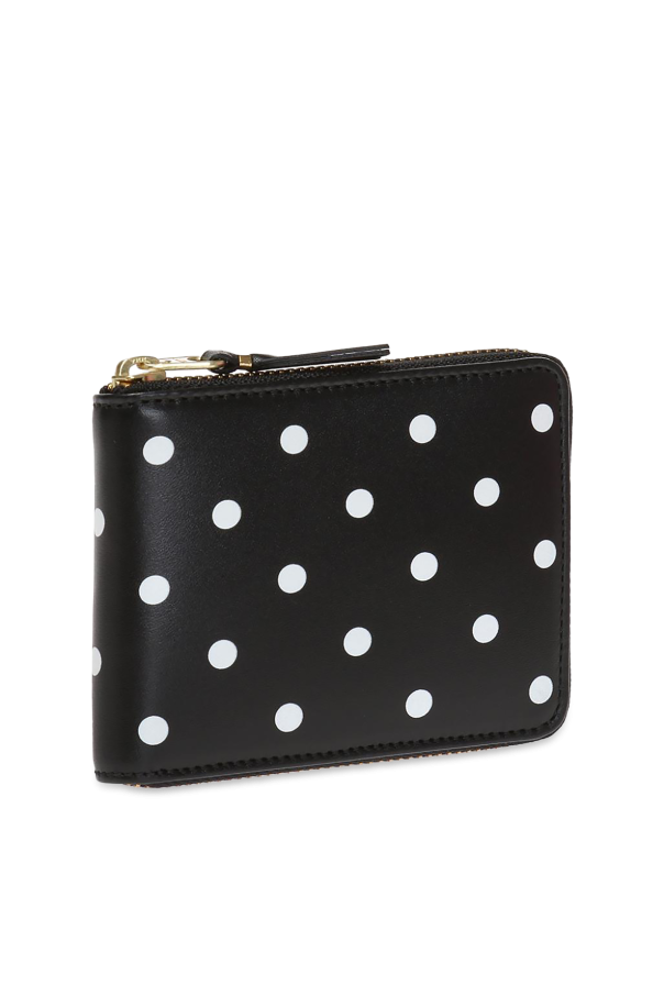 Black wallet featuring white polka dot pattern from Comme de Garçons. Made of cow leather. Zip-around fastening. Interior has bills compartment, 1 snap fastening coins pocket, 1 slip pocket and 3 card slots. Gold-tone metal hardware.