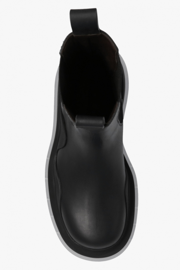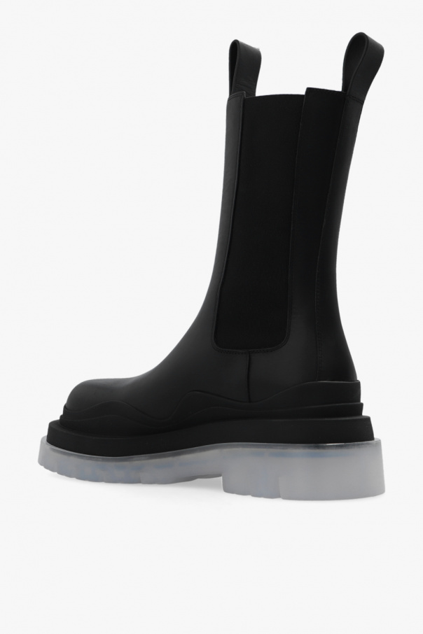 Black ‘Tire’ ankle boots from Bottega Veneta. Crafted from calf leather, this model features rubber trims, elastic panels on the sides and a light grey transparent rubber sole.