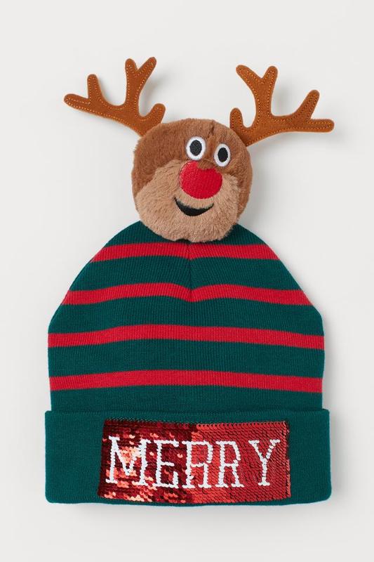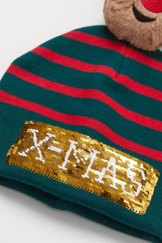 Двухслойная шапка из мягкой тонкой вязки с аппликациями и текстовым мотивом.