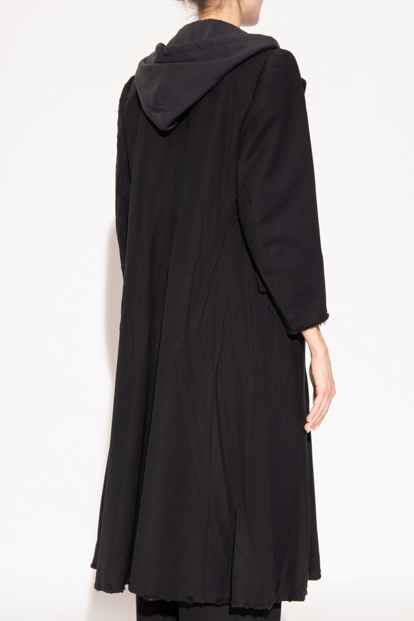 Black double-breasted coat with a drawcord-adjustable hood from Balenciaga. Fastened with buttons, a silver-tone and gold-tone hook and a crystal-bejewelled button, this style features a vintage effect, two patch pockets, two flapped pockets and long sleeves.