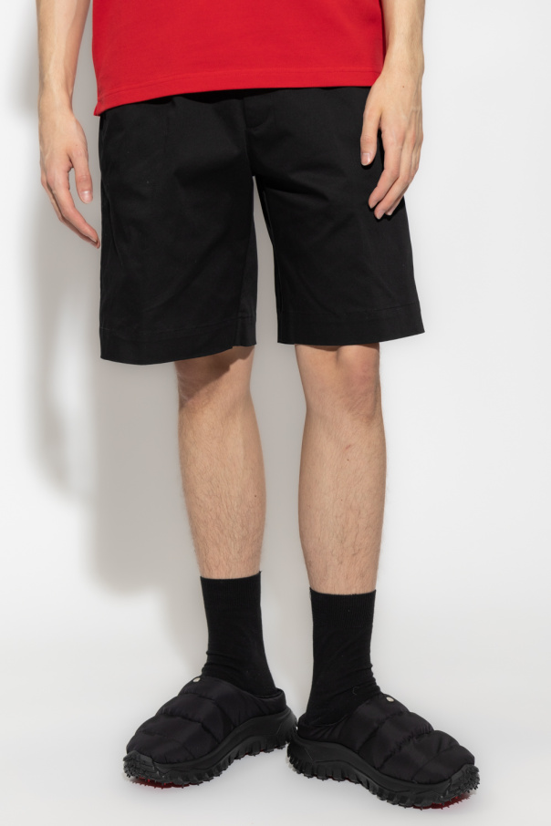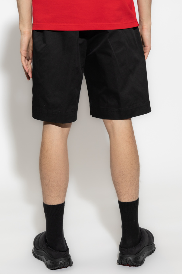 Black shorts from Moncler. Made of cotton. Fastened with a zip, this pair features an elastic waistband with navy, white and red drawstrings, felt logo patch at the back, two front pockets and one zipped back pocket.