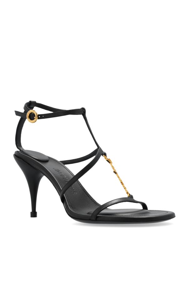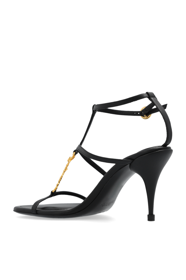 Black ‘Pralu’ heeled sandals from Jacquemus. Made from leather with a round toe, this model sits on a black leather sole and features an adjustable buckle strap around the ankle and gold-tone logo hardware on the front.
