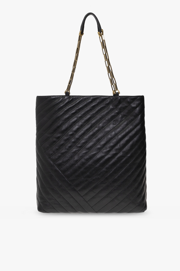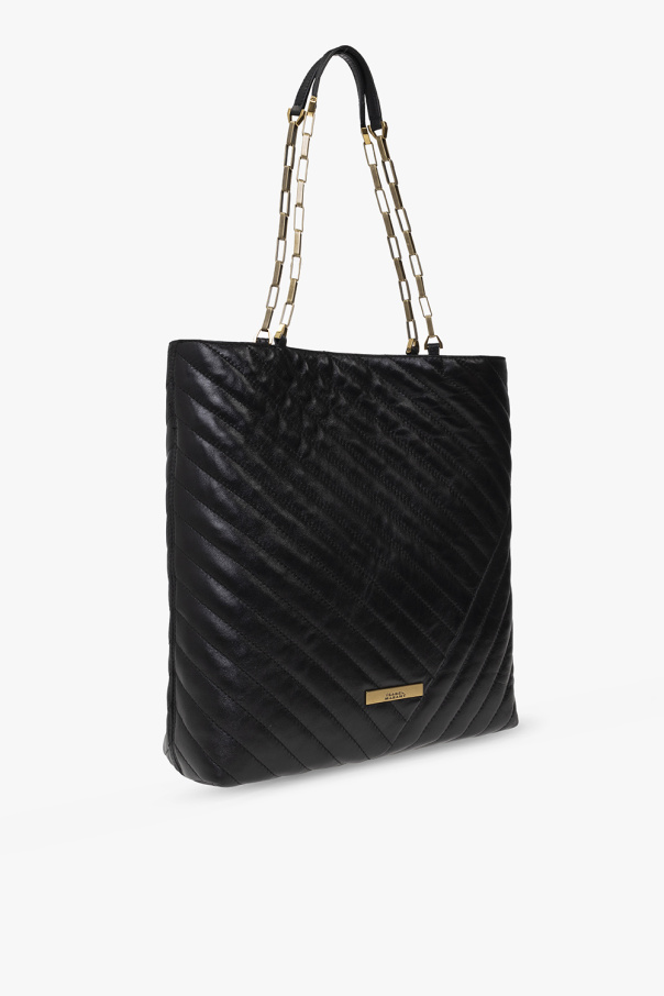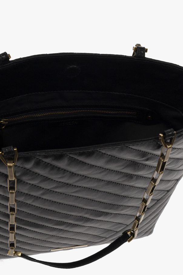 Black ‘Merine’ quilted shopper bag from Isabel Marant. Made of lamb leather, this design fastens with a magnetic snap and is decorative logo-engraved metal detail. It is complete with two chain handles, antique gold-tone metal hardware and one internal compartment with one slip pocket and one zip pocket.