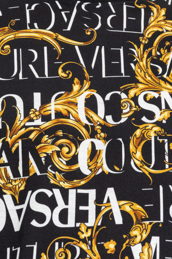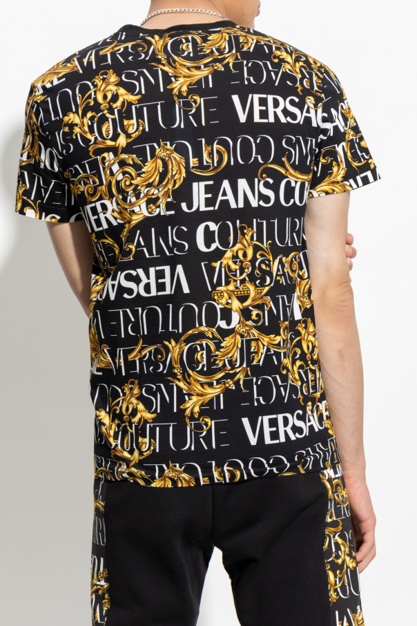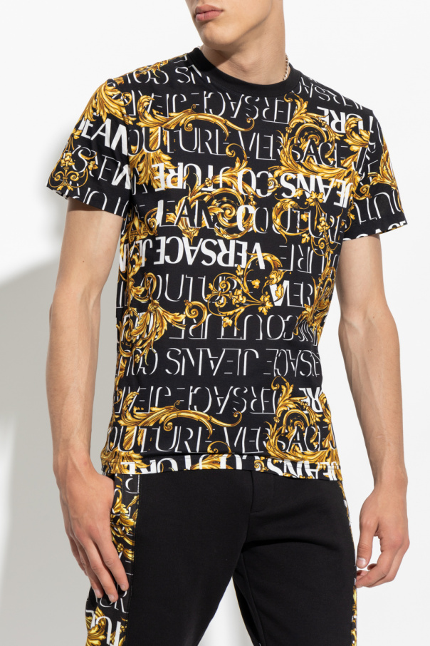 Black T-shirt from Versace Jeans Couture. Made of cotton, this short sleeve design features the label’s signature Baroque motif in brown and yellow, logo pattern and ribbed crew neck.