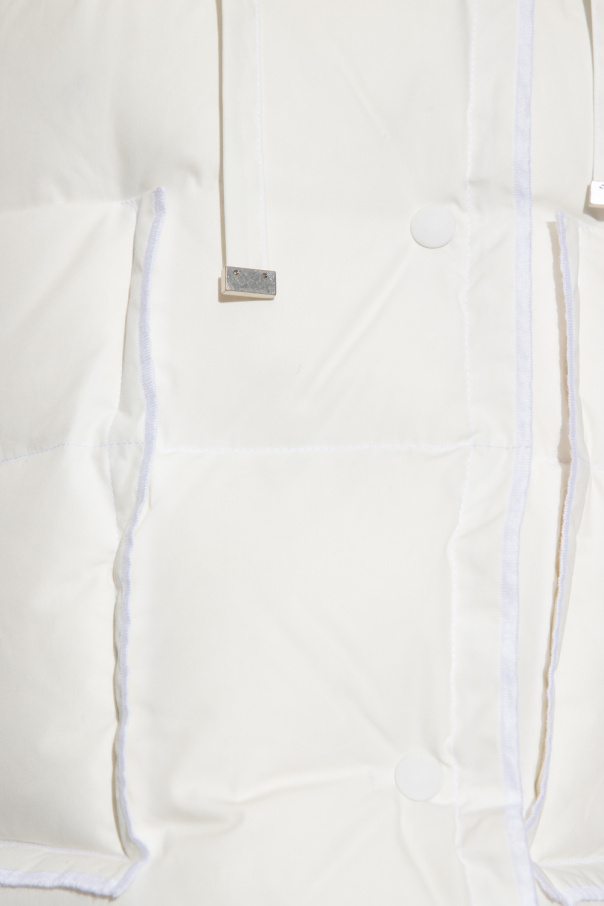 White ‘Sandy’ quilted down jacket from Moncler Genius, the ’2 Moncler 1952’ collection. Crafted from cotton canvas, this garment features snaps with a concealed placket, detachable drawstring hood, logo patch on the shoulder, two front pockets, drawstring hem and long sleeves with ribbed knitwear cuffs.
