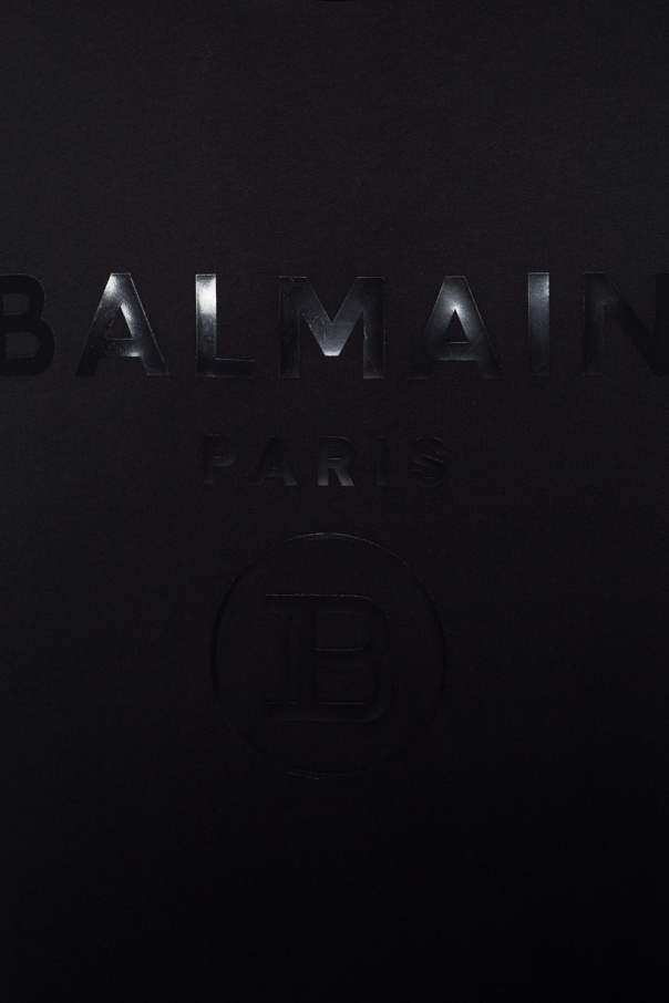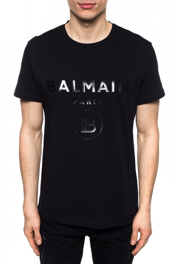 Black crewneck T-shirt from Balmain. Made of cotton. Embellished with printed brand's logo across the front.