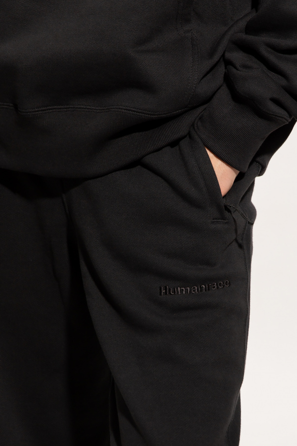 Black sweatpants from ADIDAS Originals x Human Race. Crafted from cotton, this pair features an elastic waistband with drawstrings, logo embroidery, two slip pockets, two zip pockets and ribbed cuffs.