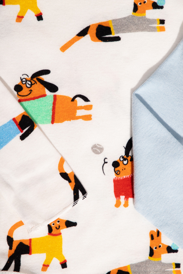 Set of two bodies from Stella McCartney Kids. Made of cotton from sustainable farms. It includes a white body with snap fastenings, printed multicolored pattern and long sleeves. The other garment is light blue and features snap fastenings and a printed multicolored pattern and long sleeves.