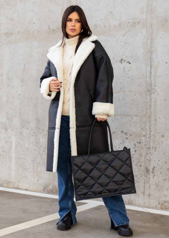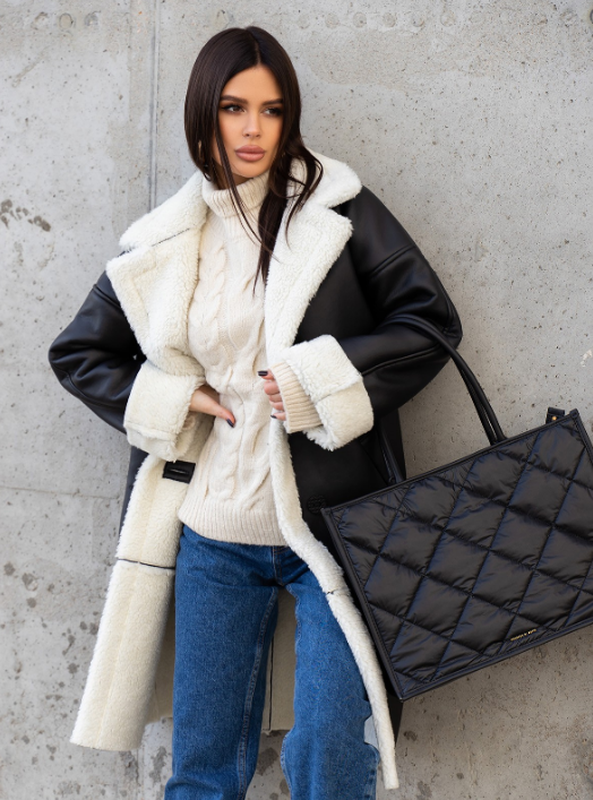 Черно-белая дубленка выполненная из эко-кожи на меху. Модель прямого свободного кроя с длиной ниже колен и воротником. Дубленка оснащена длинными рукавами с подворотами и карманами. Нижний срез не обработан швами.