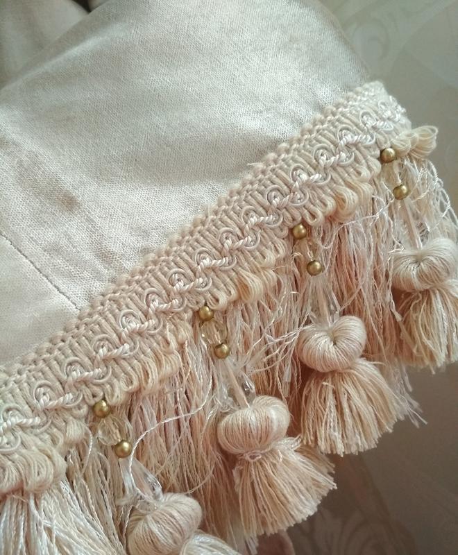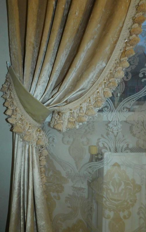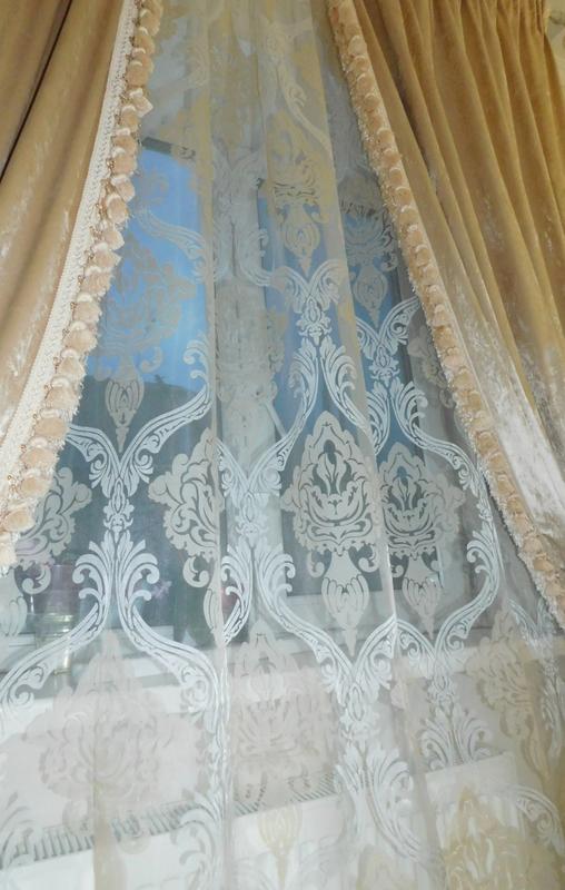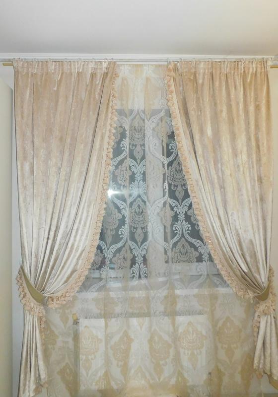 Шикарні штори з колекції натурального порт'єрного оксамиту на бавовняній основі «Fluid» Поєднання віскози, бавовни та поліестеру підсилює блиск і підкреслює привабливий зовнішній вигляд тканини. М'якість і розкішність тканини підкреслює бахрома в тон штори. Ніжна тюль, органза з малюнком дамаск Розмір Штори 140 м *2 шт Тюль 200 м * 1 шт Підхоплення з бахромою 2 шт Висота 2.34 м