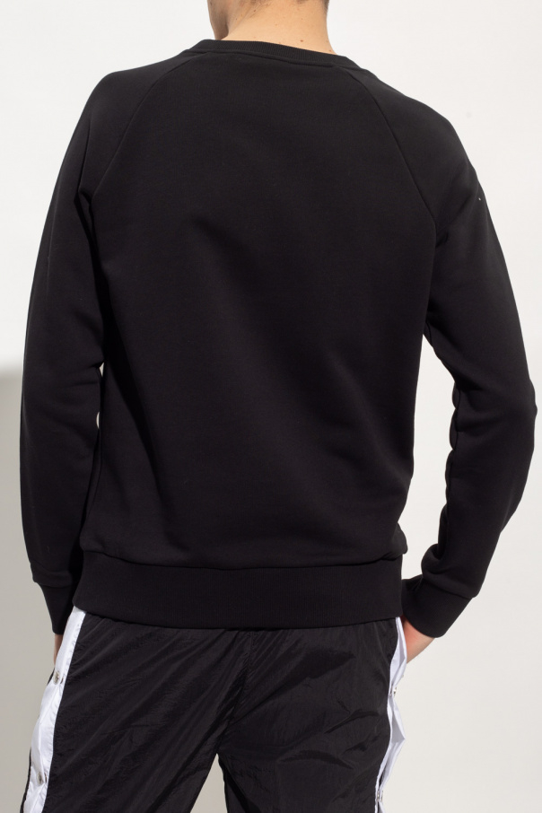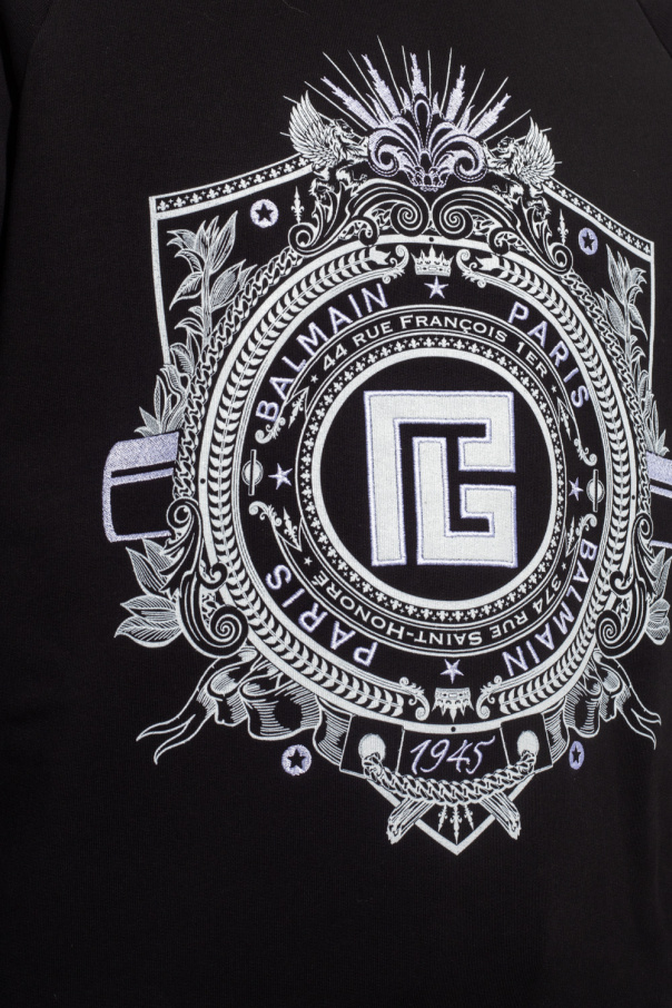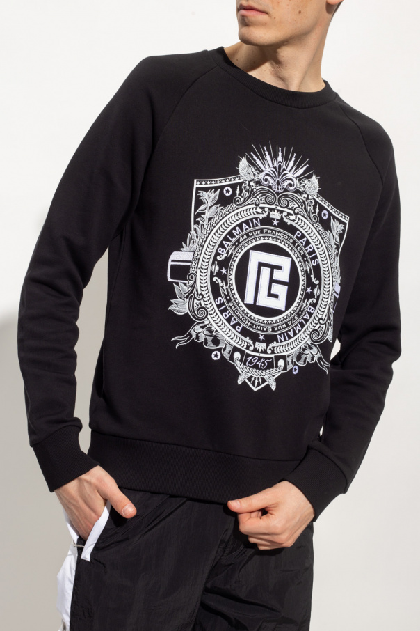 Black crewneck sweatshirt from Balmain. Crafted from cotton jersey, this style features a logo graphic rendered in print and embroidery and elasticized trims on the collar, bottom hem and cuffs.