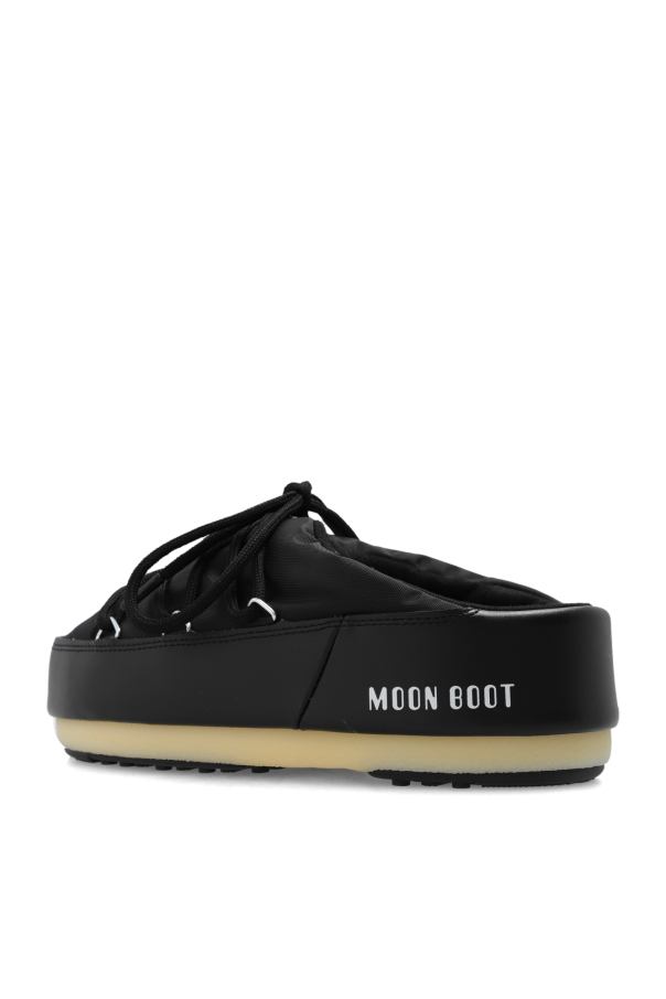 Black shoes from Moon Boot. Made of waterproof material with a slip-on silhouette, this model sits on a black tread rubber sole with suction cups to ensure superb grip on any surface and showcases a white logo printed on the sides, silver-tone metal hardware and decorative lace-up detailing on the front.