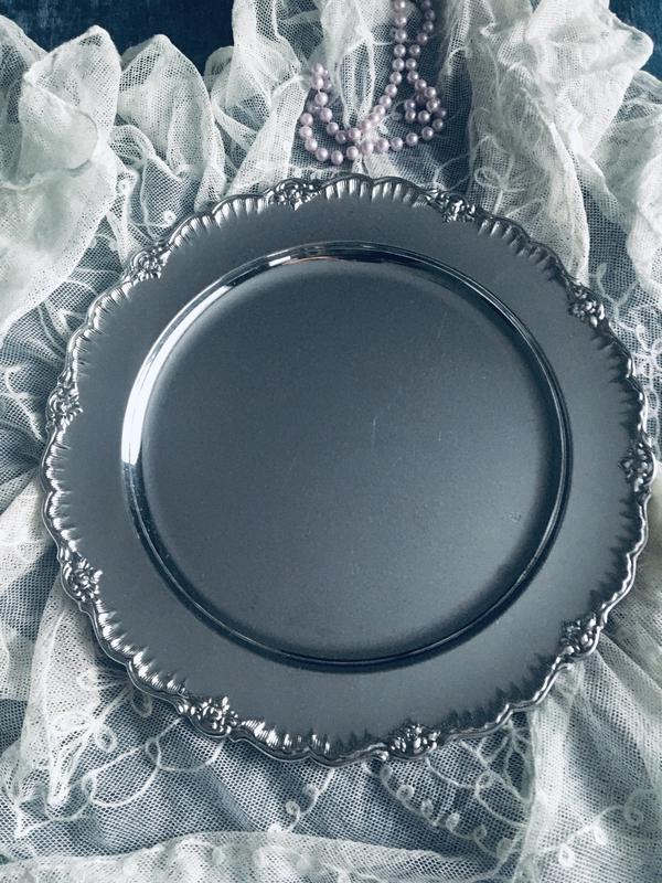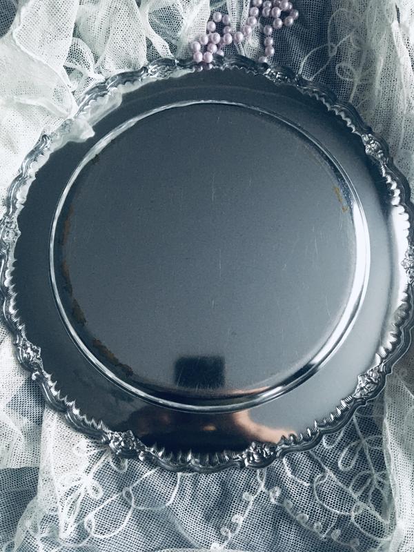 🔥 Чудова🔥 винтажный поднос или подставная тарелка в очень красивом состоянии. Швеция. Хромована латунь. Тяжелая, массивная, добротная. Присутствующие небольшие следы использования и ступенчатое покрытие с нижней части (крайнее фото). Поднос смотрится очень красиво и достойно. Ободок украшен объемными венчиками цветов и рельефным ободком. Отличная полезная вещь для Вашего дома. 🥰 👍 Диаметр - 32 см.