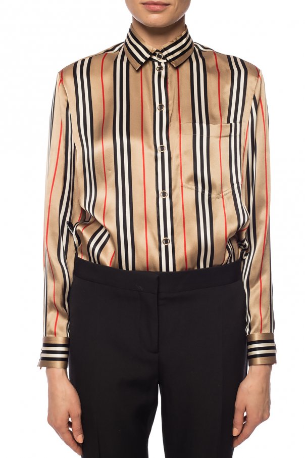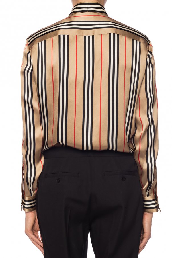 Beige, black and red shirt from Burberry. Made of silk. Fastened with snaps featuring gold-tone metal rings. Decorated with a stripe pattern.