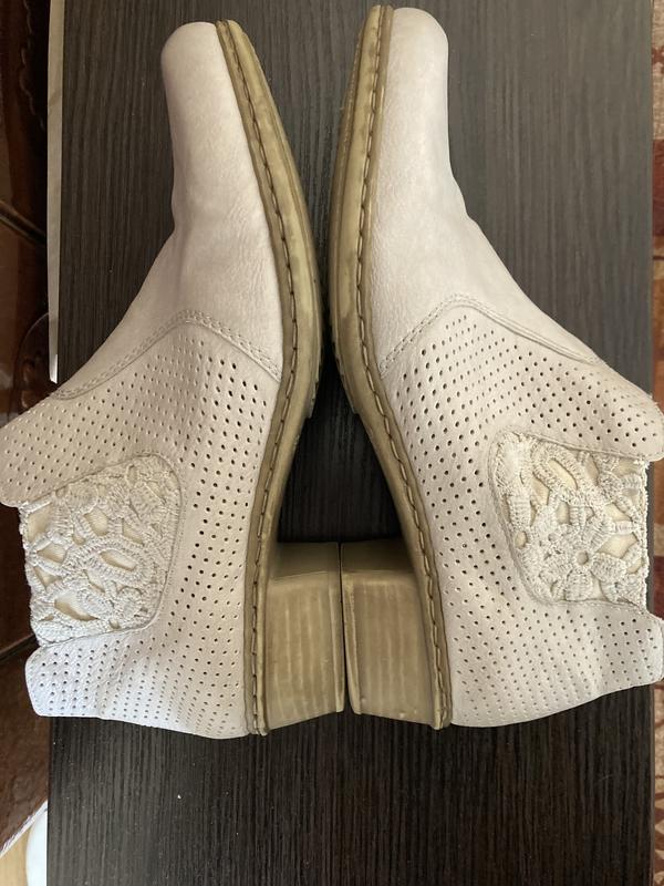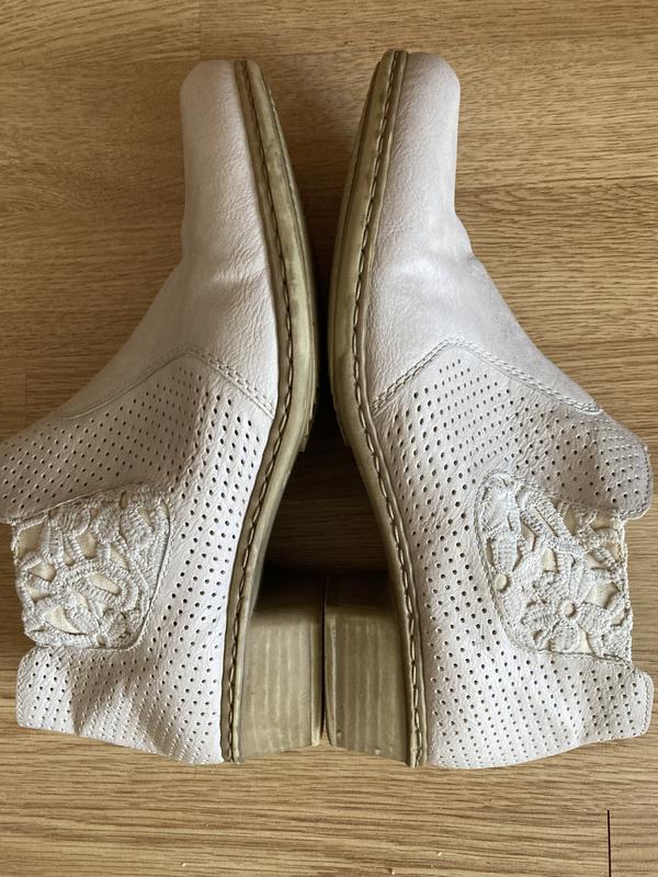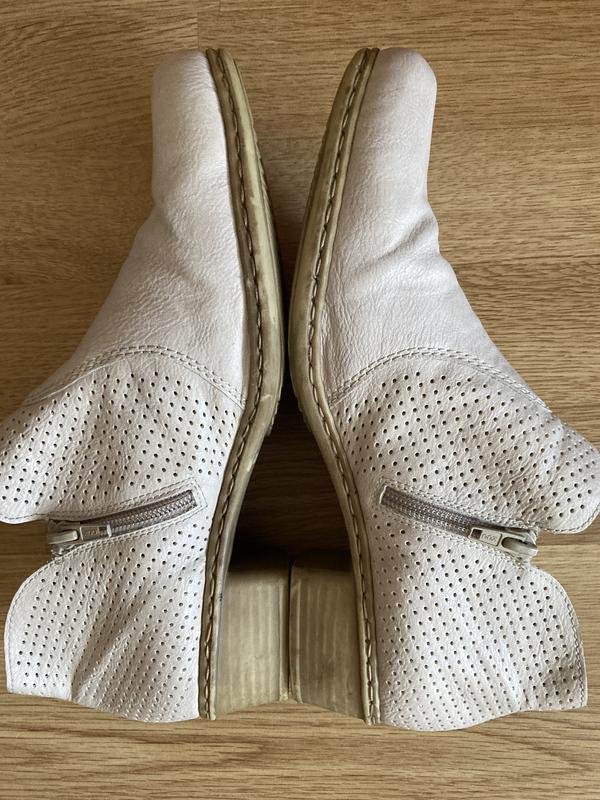 Очень удобны.На среднюю ногу.Внутри текстиль.Стелька кожаная 27см.Высота каблука 3.5см.Сбоку на замок.Обхват вверх 30см.Колир слоновой кости