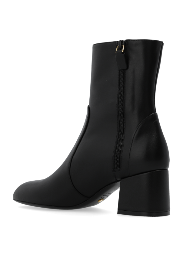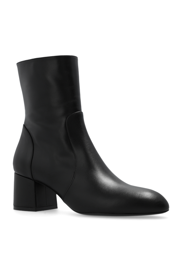 Black ‘Flareblock’ heeled ankle boots from Stuart Weitzman. Made of leather with a round toe, this model sits on a black leather sole and features a side zipper.