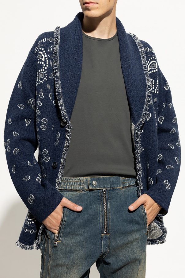 Navy ‘Bandana’ cashmere cardigan from Alanui. Crafted from cashmere, this garment features button fastenings, embroidered paisley motif in grey and white, logo patch, decorative collar, fringe edges and long sleeves.