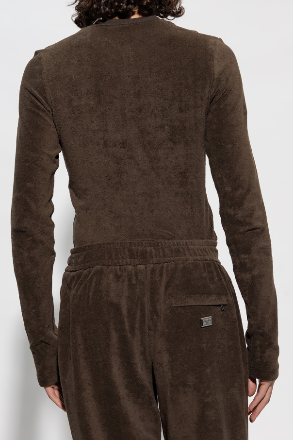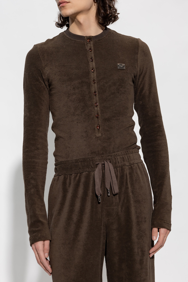 Brown crewneck T-shirt with long sleeves from Dolce & Gabbana. Made of cotton, this style fastens with buttons and features a logo patch and ribbing on the collar.