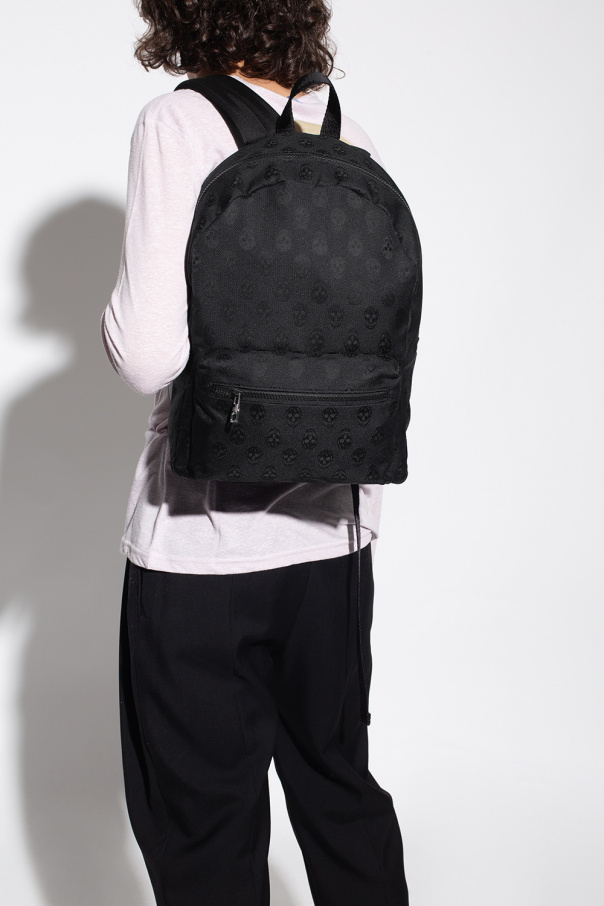 Black backpack from Alexander McQueen. Enriched by a logo pattern, this design secures with a two-way zip and showcases an external zip pocket on the front, a half-round handle, adjustable shoulder straps, black silver-tone metal hardware and one internal compartment with a slip pocket.