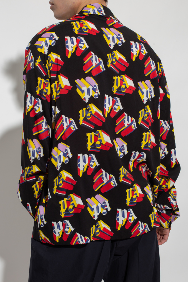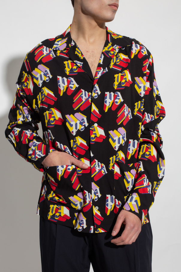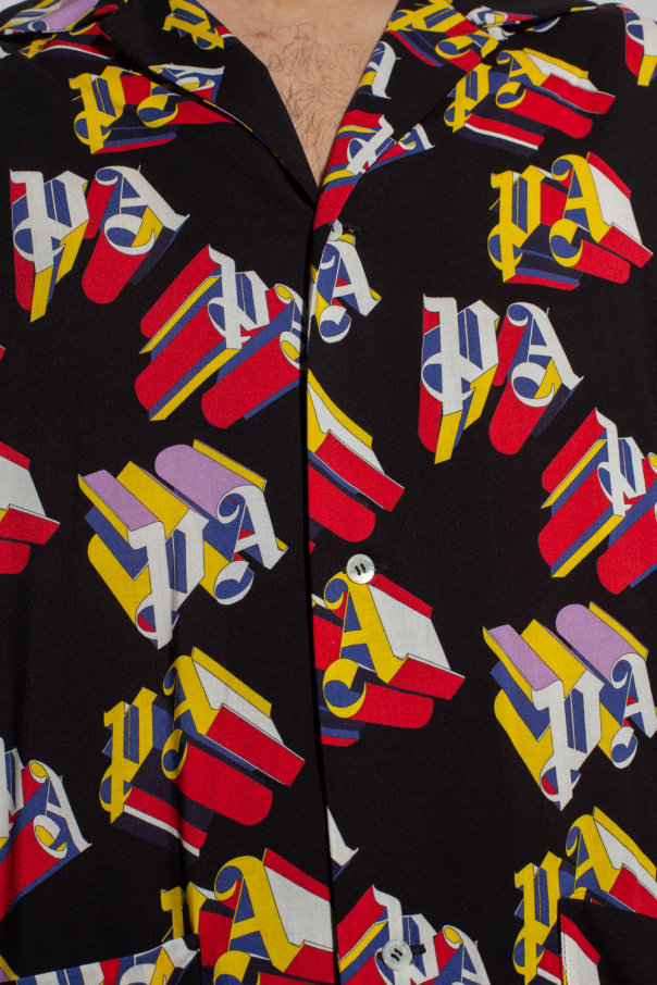 Black shirt from Palm Angels. Fastened with buttons, this garment features a multicolored logo pattern and long sleeves.