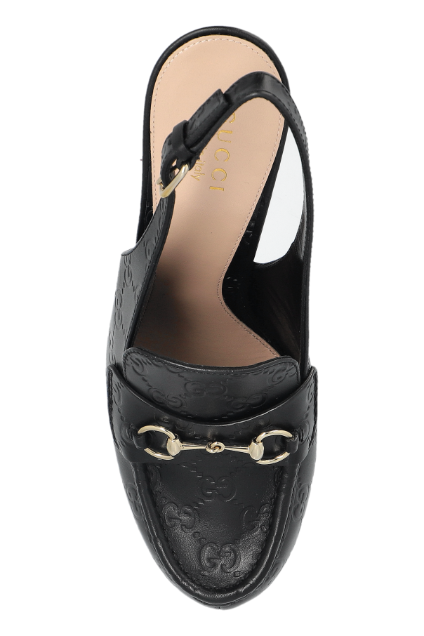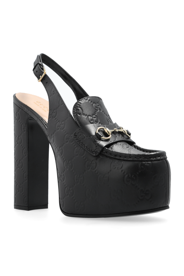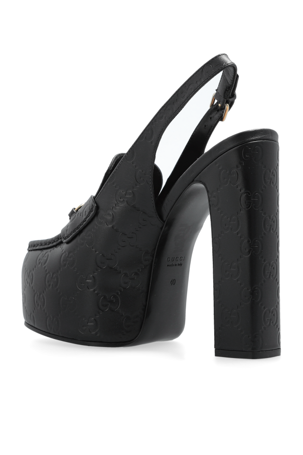 Introducing the epitome of sophistication, the High Heel Shoes by Gucci, a revered name in luxury fashion. Crafted in a timeless black hue, these heels boast an exquisite embossed leather finish, subtly hinting at the iconic brand's logo. The high block heel and platform not only enhance the shoe's elegance but also ensure unparalleled stability, complemented by an adjustable strap with a petite buckle at the back. These heels are adorned with a striking metal embellishment on the front, elevating their status as a must-have for formal ensembles. Embodying a seamless blend of classic elegance and contemporary flair, they stand as a testament to the brand's commitment to innovation and Italian craftsmanship. Why Choose This Product? Premium quality leather construction. Sturdy block heel for enhanced comfort. Elegant metal detailing for a distinctive look. Designed by the revolutionary Alessandro Michele. Part of the luxurious Kering group.