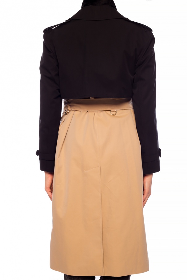 Beige and black ‘Deighton’ double-breasted trench coat from Burberry. Made of cotton. Fastened via buttons. Features 2 slip pockets on the front, epaulettes on the shoulders and single vent on the back. Cotton lining is embellished with signature beige, black and red check print.