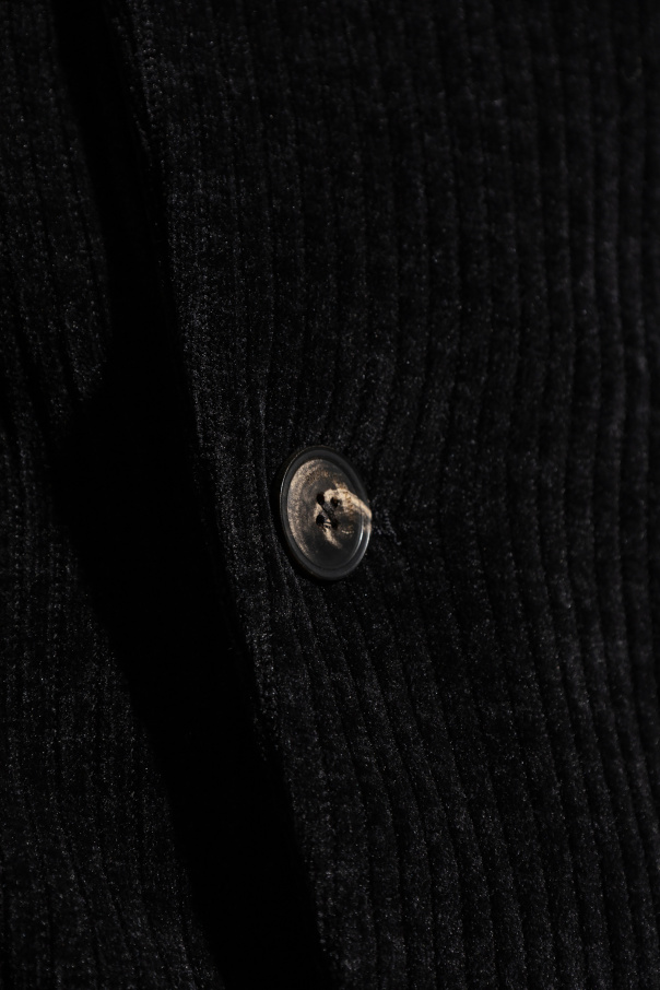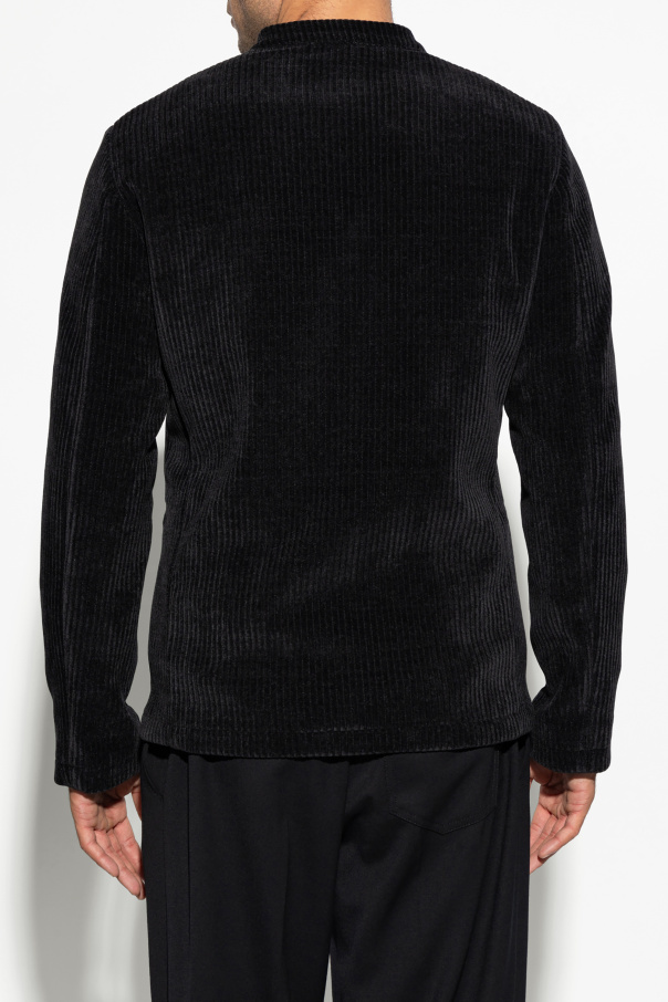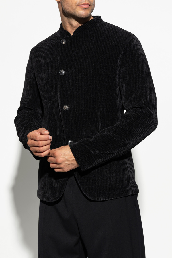 Introducing the exquisite Black Corduroy Men's Blazer from the exclusive collection by Emporio Armani. Crafted with meticulous attention to detail, this blazer epitomizes sophisticated elegance and modern design. Constructed from premium corduroy, the blazer features a distinctive texture that exudes refined charm. The deep black hue enhances its timeless appeal, making it a versatile addition to any gentleman's wardrobe. The blazer boasts a classic straight cut, accentuated by a unique button configuration with four front buttons, one of which is positioned slightly higher for a touch of individuality. The stand collar brings a contemporary flair, setting it apart from traditional designs. Functionality meets style with two front pockets conveniently located at the lower section of the blazer, and a fully lined interior ensuring maximum comfort and ease of wear. The metal buttons add a subtle touch of elegance, emphasizing the luxurious nature of this piece. Why Choose This Product? Impeccable craftsmanship by Emporio Armani Luxurious corduroy material with a distinctive texture Classic yet modern design with unique button placement Comfortable fully lined interior Versatile black color perfect for both formal and casual occasions