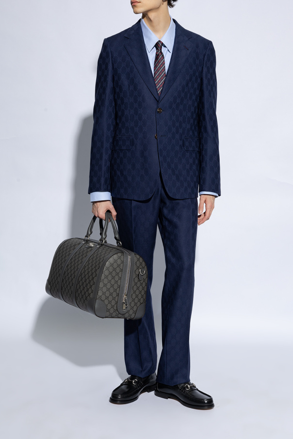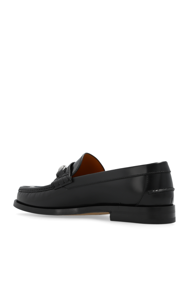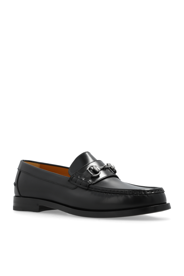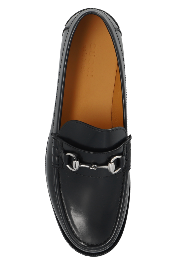 Black loafers from Gucci. Made of leather, this model sits on a beige leather sole and showcases the brand's signature antiqued gold-tone horsebit hardware on the front.