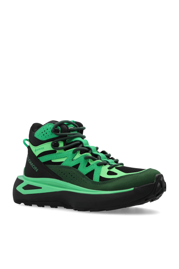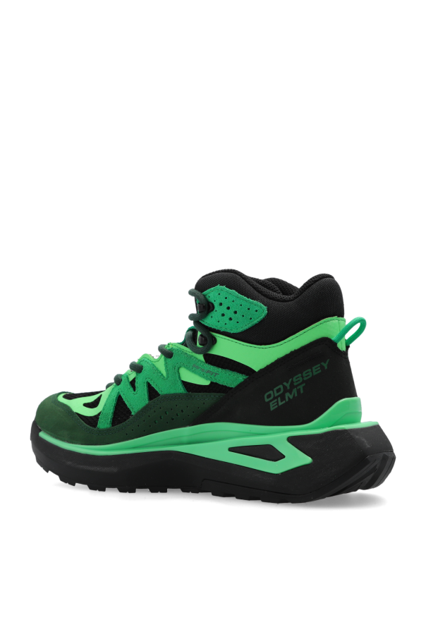 Green and black ‘ODYSSEY ELMT MID GTX’ high-top sneakers from Salomon. Made of leather, fabric and synthetic material and supported by a waterproof GORE-TEX coating, this lace-up model showcases the brand's logo and sits on a sole with Contagrip® technology built for maximum grip on loose, soft, rugged, and uneven surfaces - it uses deep, sharp lugs made from a compound that focuses on adhesion.