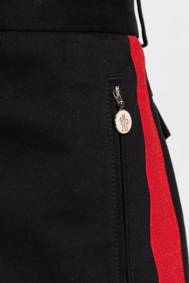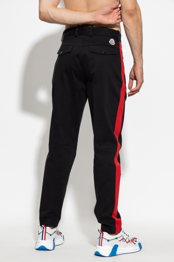 Black trousers from Moncler. Made of cotton, this pair features the label’s signature felt patch, two front zip pockets, two snap-fastened back pockets and slightly tapered legs with red side stripes.